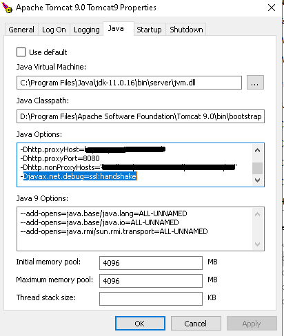 when having SSL handshake errors you can add to Tomcat Java Options following parameter